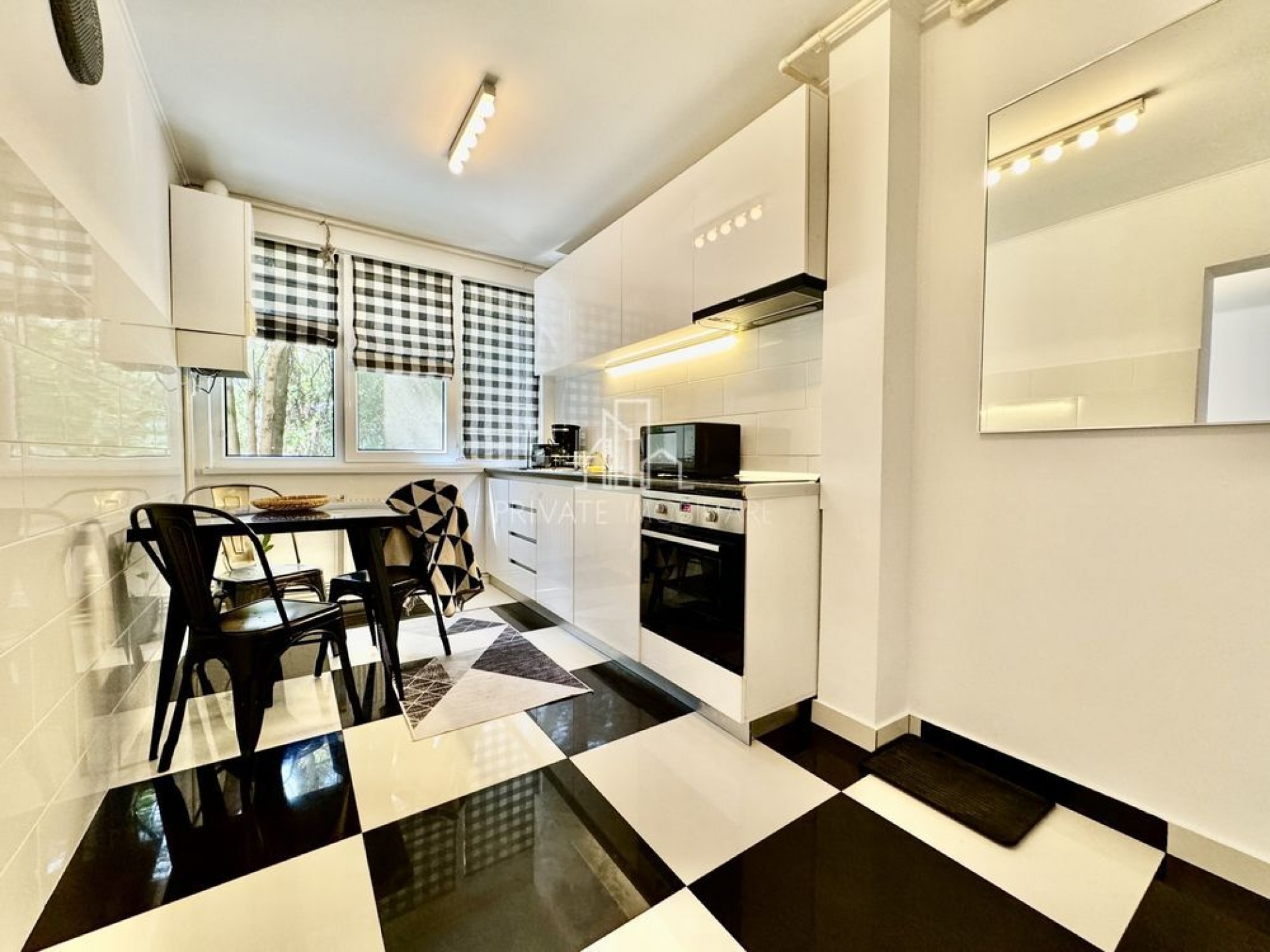 Apartamentul este format din 1 dormitor cu pat matrimonial 160x200 cm, 1 living cu canapea extesibila cu saltea pentru dormit zilnic, birou și TV Smart, 1 Bucătărie echipata complet (vase, tacâmuri, plita, cuptor electric, cuptor microunde, aparat cafea si aspirator Miele).