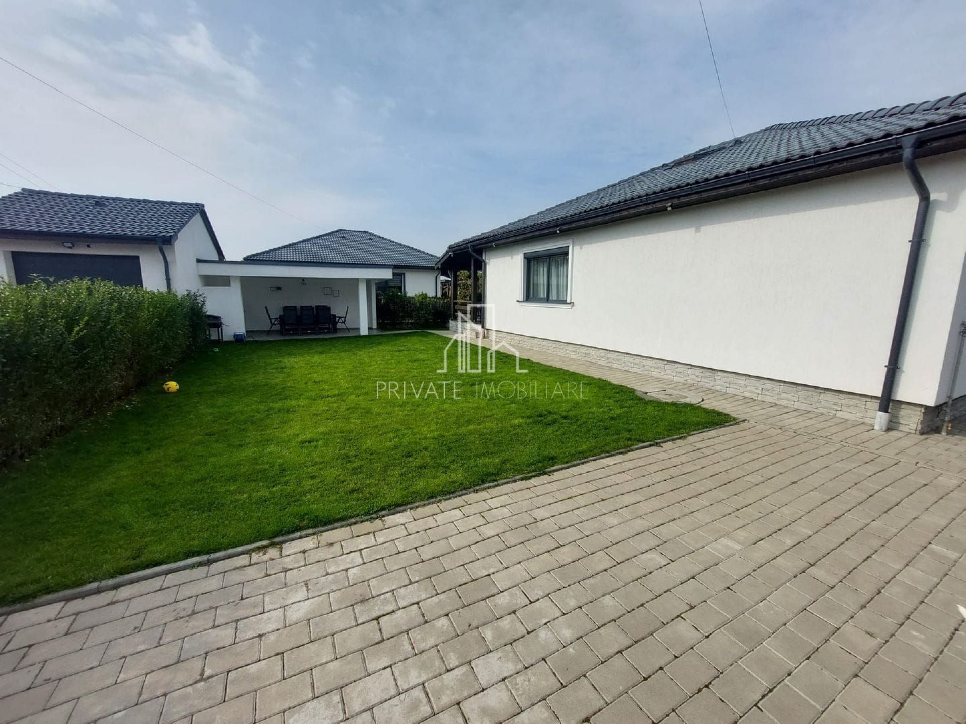 Curtea casei este frumos amenajată cu pavaj, gazon, pomi ornamentali etc. In curte se mai regăsește o bucătărie de vară cu loc de servit masa.