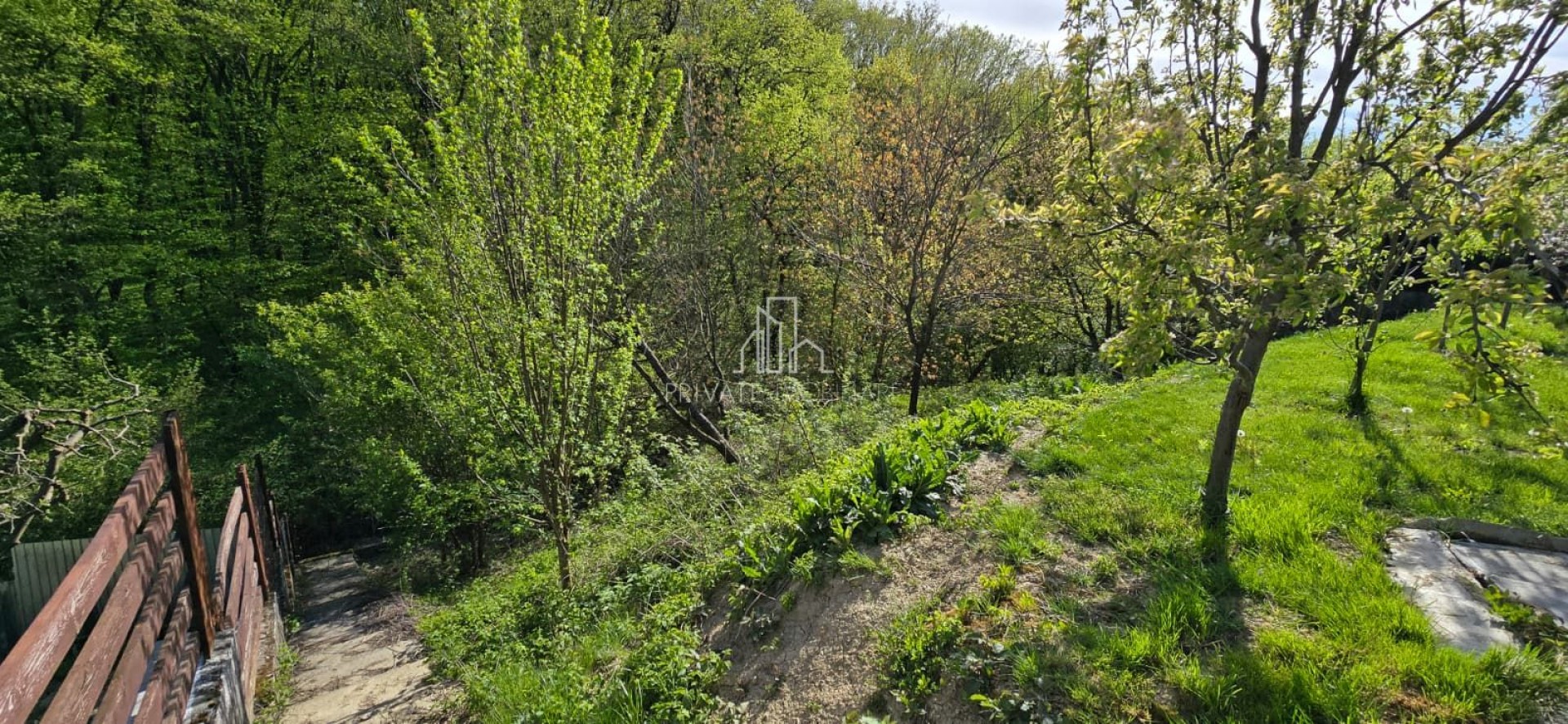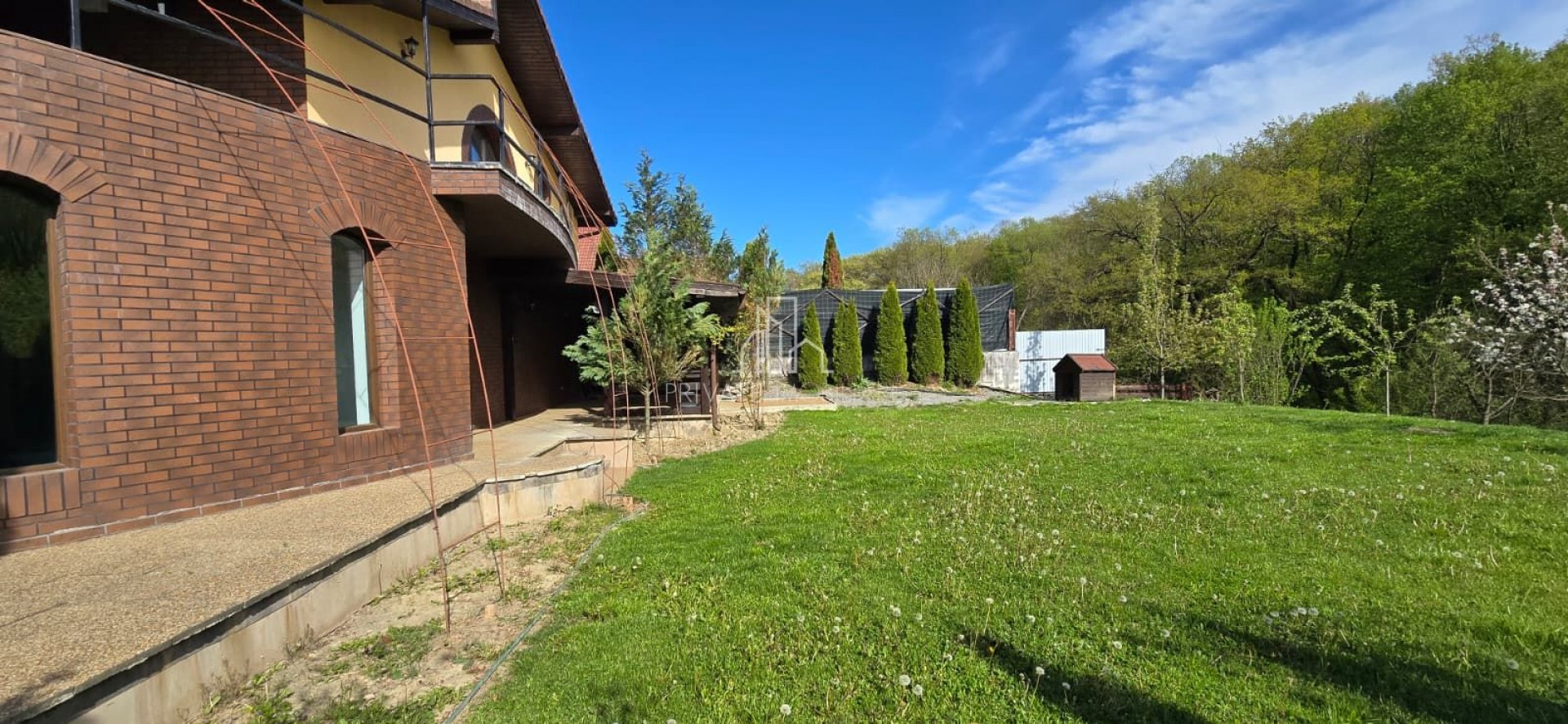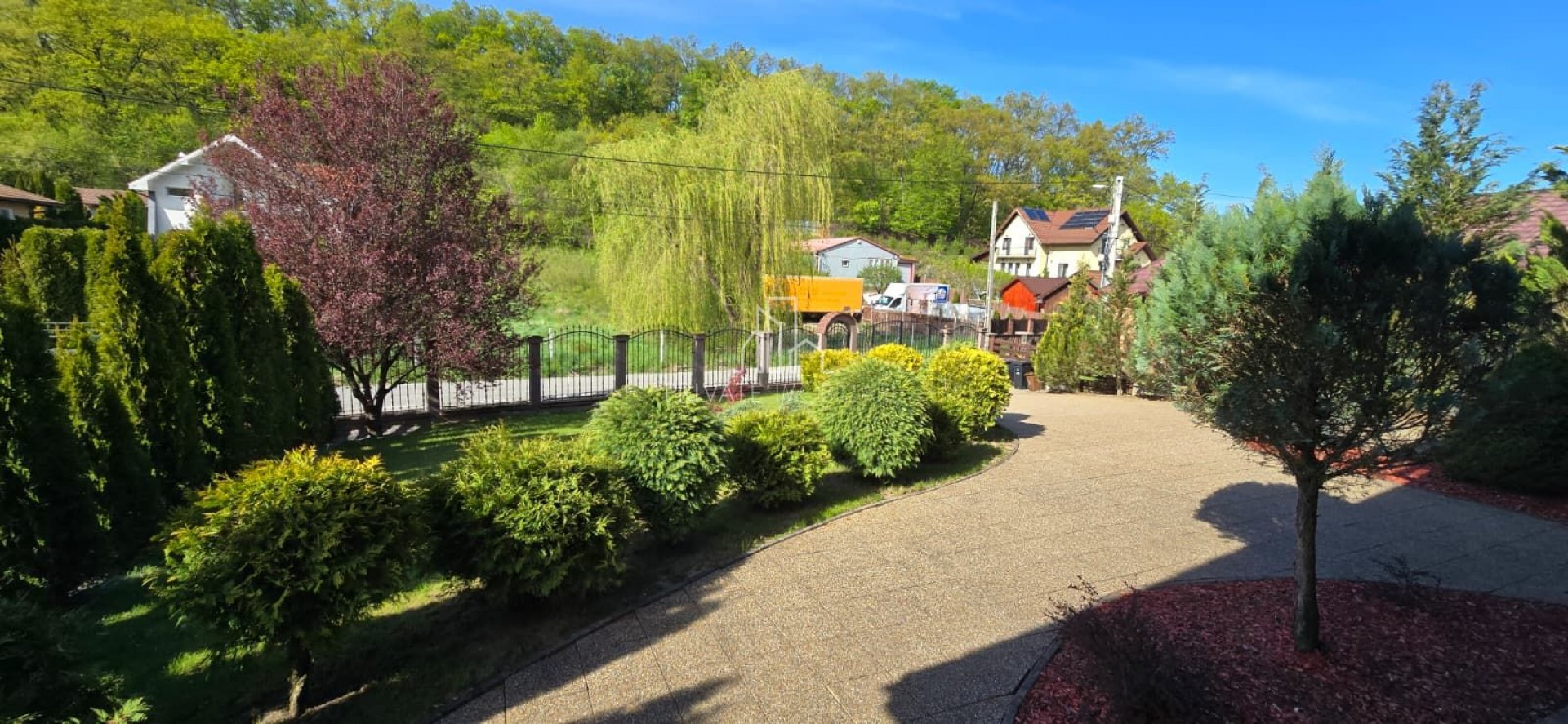 Curtea este frumos amenajată cu gazon și pomi ornamentali si o livada in partea din spate după cum se poate vedea din poze. Exista si poarta in partea din spate direct catre padure.